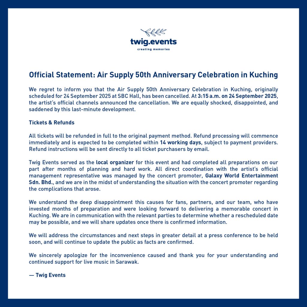 For the first time ever, Air Supply is coming to Kuching — bringing nearly five decades of timeless hits and memories to the stage in a special one-night-only performance.